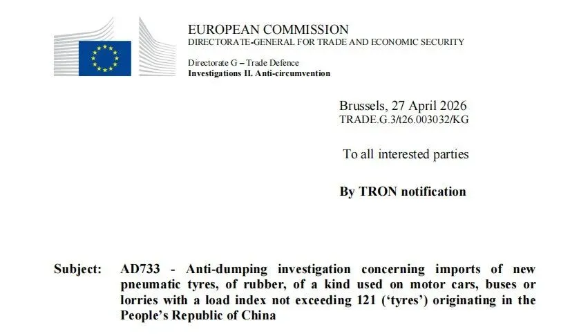 该项调查于2025年5月21日应“反对不公平轮胎进口联盟”申诉,正式发起。2025年7月25日起,欧盟对涉案产品实施进口登记,以备追溯征税。