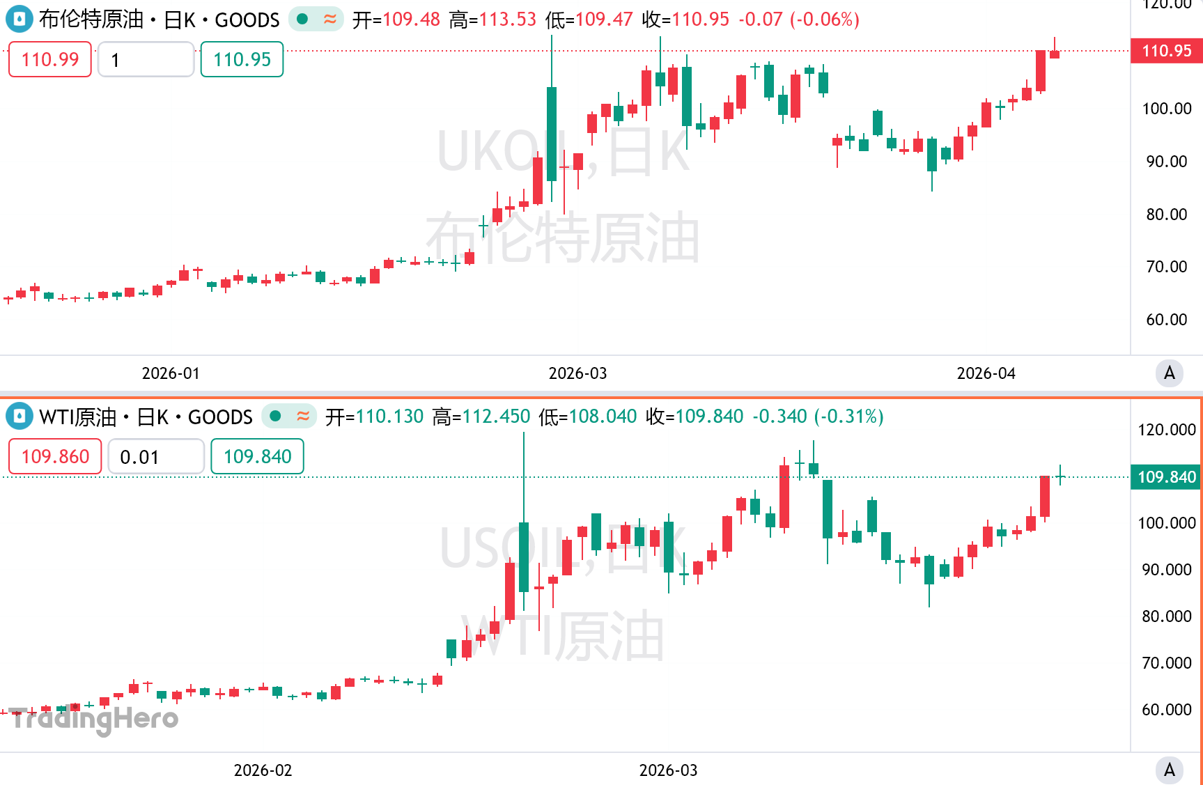 4月30日当周,国际油价大幅攀升,成为本轮中东冲突以来最剧烈的一次上涨。单周涨幅达到10%,价格突破110美元/桶;6月交割的布伦特原油期货大涨4.1%,至每桶123美元,创2022年以来最高水平;同步走强,稳定在108美元上方。