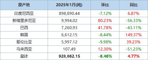 以下为根据中国海关总署官网数据整理的2025年1月镍铁进口分项数据一览表: