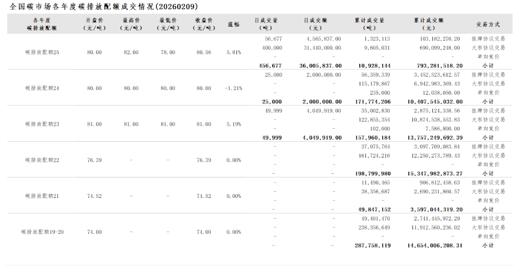 2026年1月1日至2月9日,全国碳市场碳排放配额成交量12,201,265吨,成交额894,491,411.80元。