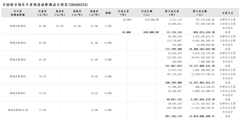 2026年1月1日至2月24日,全国碳市场碳排放配额成交量13,483,905吨,成交额988,524,251.80元。