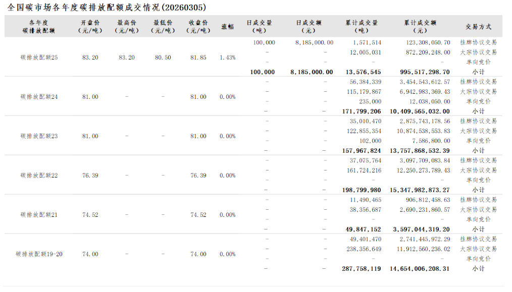 2026年1月1日至3月5日,全国碳市场碳排放配额成交量14,882,306吨,成交额1,099,366,032.30元。