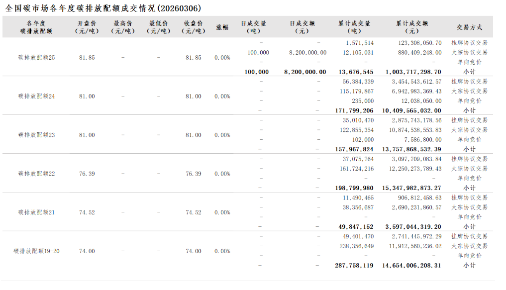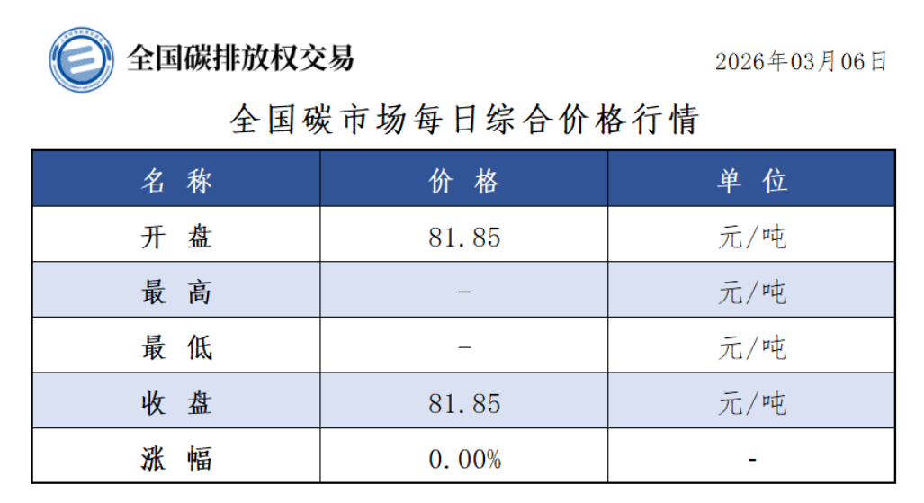 3月6日全国碳市场价与前一日持平 碳排放配额总成交100000吨【交易日报】