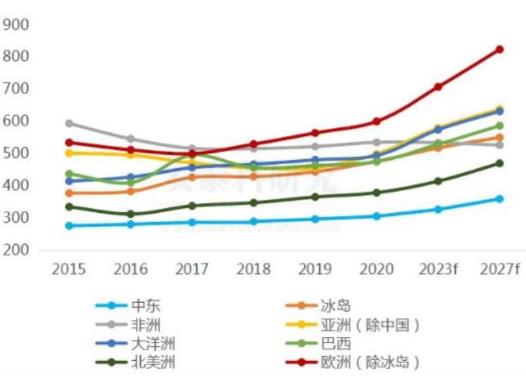 图为全球各区域电解铝用电成本对比