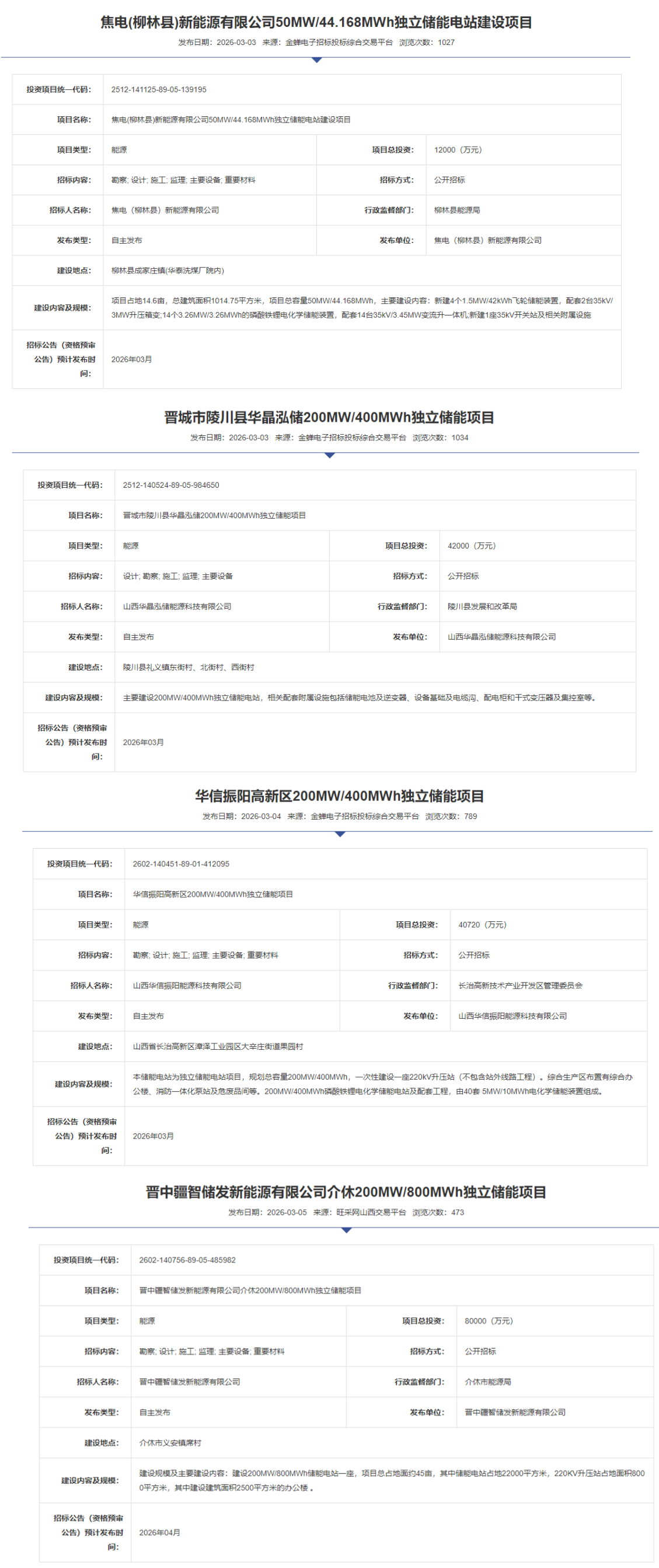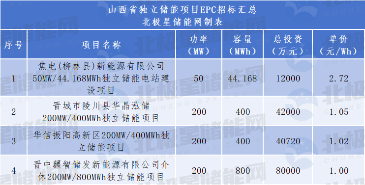 北极星储能网讯:近期,山西省发布多个独立储能项目EPC招标计划,共包含4个项目,总规模为650MW/1.644GWh。