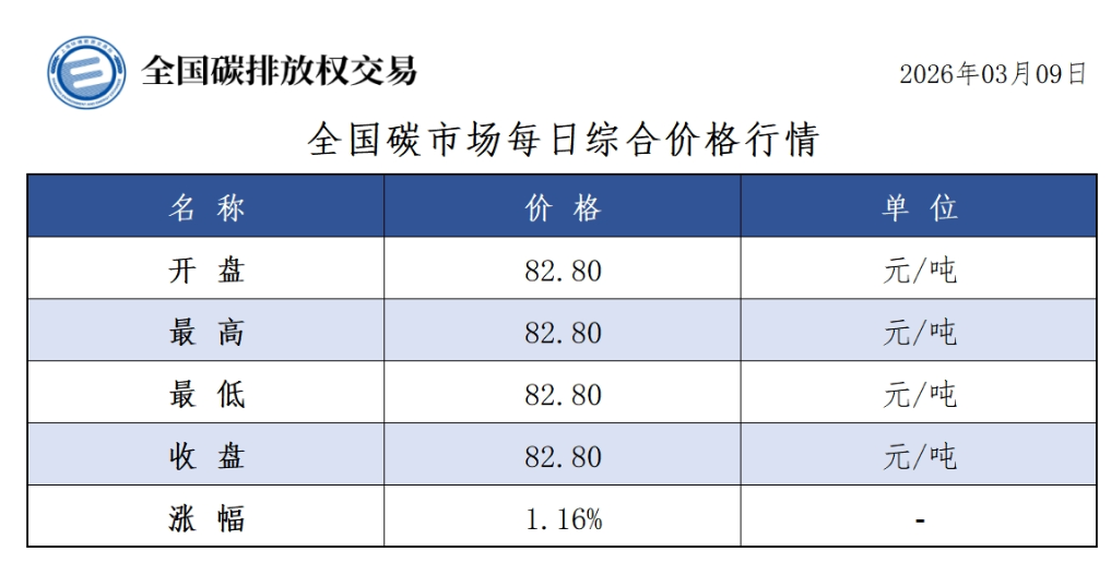 今日全国碳市场综合价格行情为: 开盘价82.80元/吨,最高价82.80元/吨,最低价82.80元/吨,收盘价82.80元/吨,收盘价较前一日上涨1.16%。