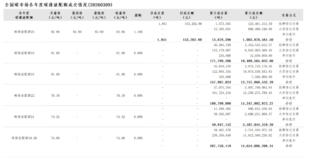 2026年1月1日至3月9日,全国碳市场碳排放配额成交量14,984,157吨,成交额1,107,719,295.10元。