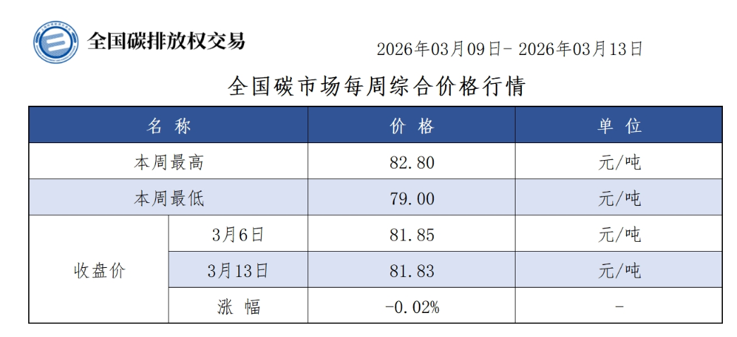 本周全国碳市场综合价格行情为:最高价82.80元/吨,最低价79.00元/吨,收盘价较上周五下跌0.02%。