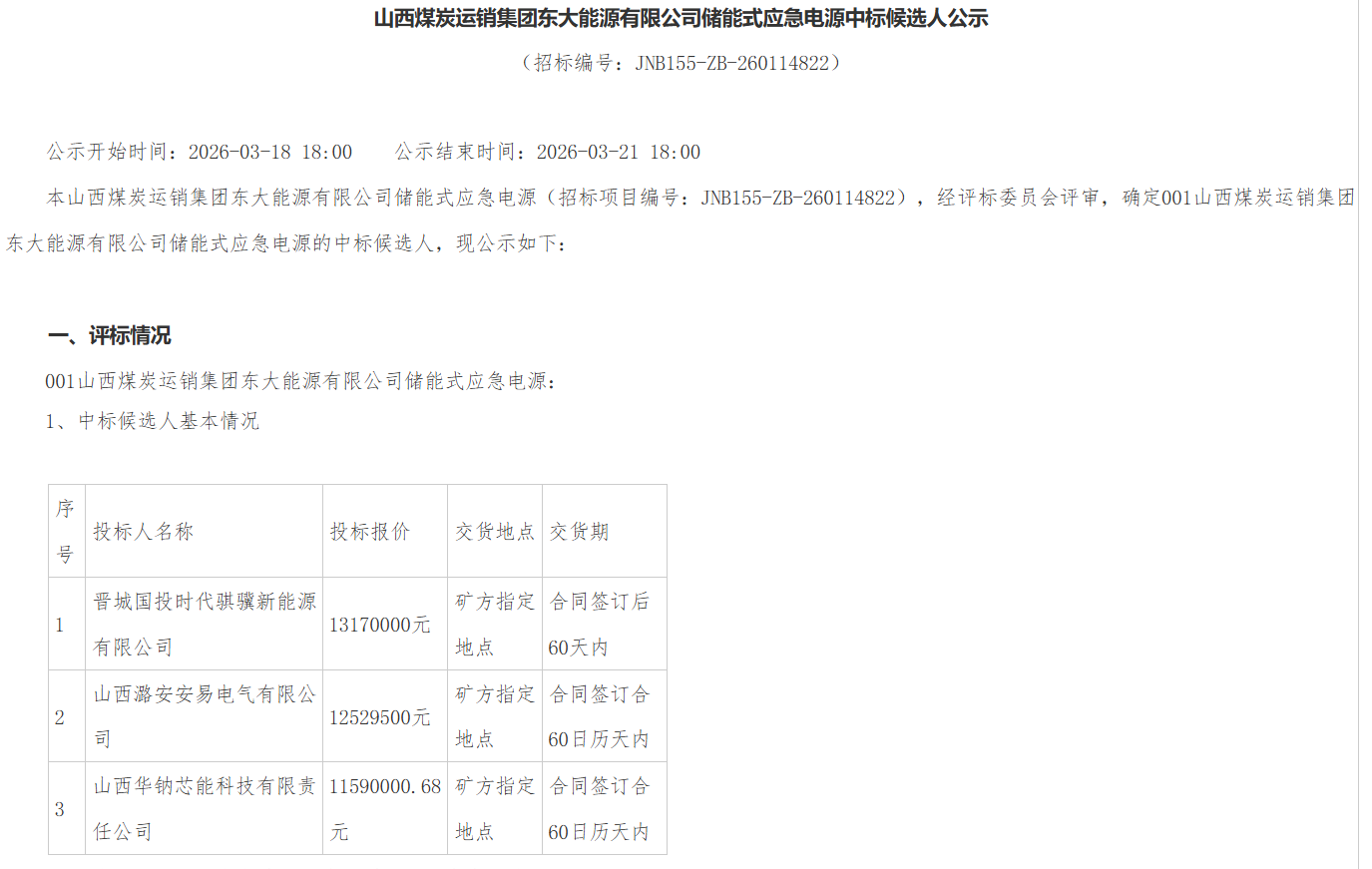北极星储能网获悉,3月18日,山西煤炭运销集团东大能源有限公司发布储能式应急电源中标候选人公示,共有3个中标候选人,包括晋城国投时代骐骥新能源有限公司,投标报价13170000元,约合单价1.0975元/Wh;山西潞安安易电气有限公司,投标报价12529500元,约合单价1.044元/Wh;山西华钠芯能科技有限责任公司,投标报价11590000.68元,约合单价0.966元/Wh。