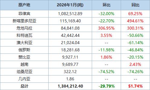 以下为根据中国海关总署官网数据整理的2026年1月镍矿砂及其精矿进口分项数据一览表: