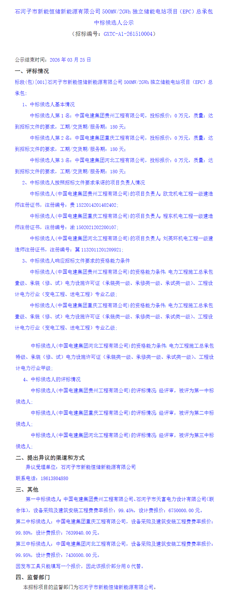 北极星储能网讯:2026年3月25日,石河子市新能恒储新能源有限公司500MW/2GWh独立储能电站项目EPC中标候选人公示,前三名中标候选人依次为中国电建集团贵州工程有限公司、中国电建集团重庆工程有限公司、中国电建集团河北工程有限公司。