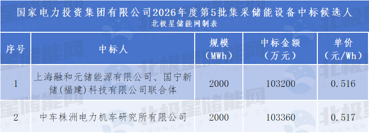 前两名中标候选人依次为上海融和元储能源有限公司、国宁新储(福建)科技有限公司联合体、中车株洲电力机车研究所有限公司。