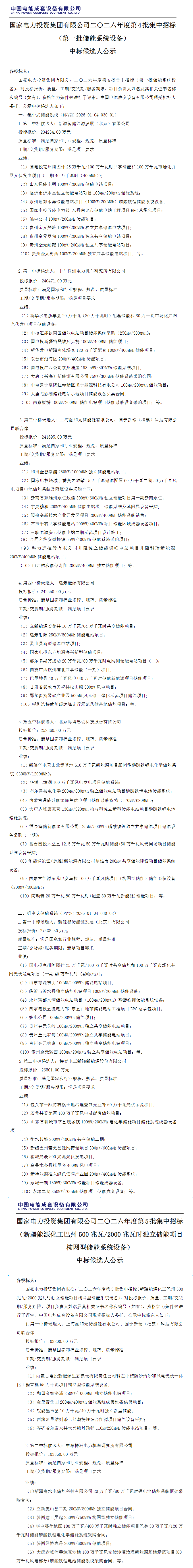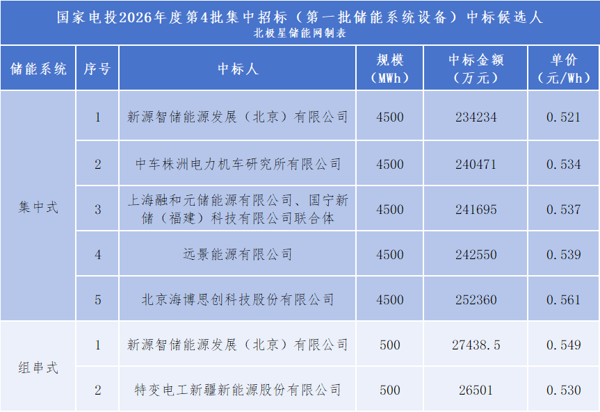 北极星储能网讯:2026年3月26日,国家电投二〇二六年度第4批、第5批集储能系统招标中标候选人公示,规模共计7GWh,其中新源智储、中车株洲所、融和元储及国宁新储联合体、远景储能、海博思创入围4.5GWh集中式储能系统,新源智储、特变电工预中标0.5GWh组串式储能系统;融和元储及国宁新储联合体、中车株洲所入围2GWh构网型储能系统。