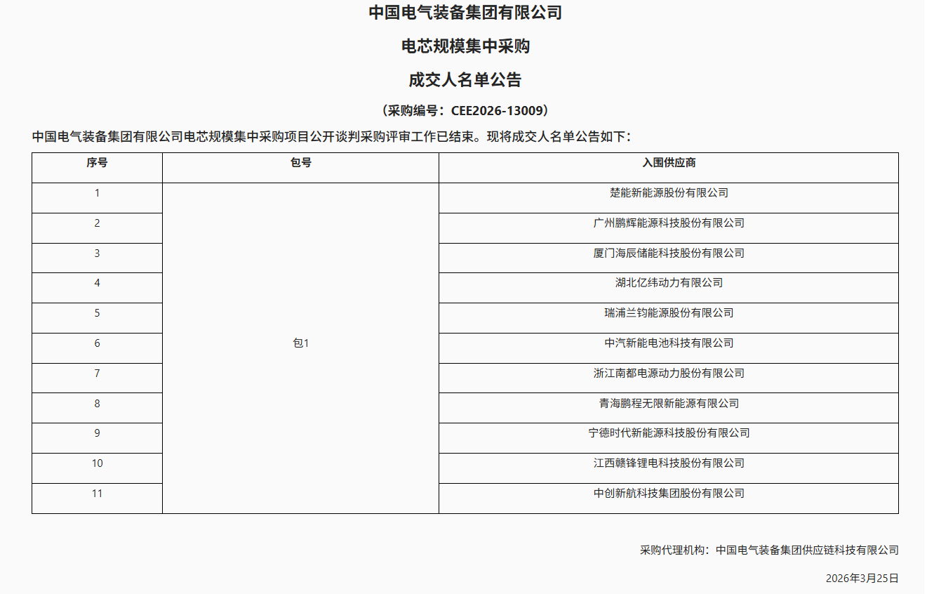 北极星储能网获悉,3月25日,中国电气装备集团有限公司电芯规模集中采购成交人名单公告,共11家供应商入围,分别是楚能新能源、鹏辉能源、海辰储能、亿纬动力、瑞浦兰钧、中汽新能、南都电源、鹏程无限、宁德时代、赣锋锂电、中创新航。
