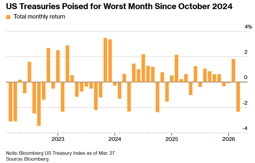 随着油价升至每桶110美元以上,且冲突几乎没有结束迹象,交易员目前主要关注的是通胀冲击。这已导致美国国债市场走向自2024年10月以来最严重的月度跌幅,因为投资者开始为美联储可能在今年年底前加息做准备。