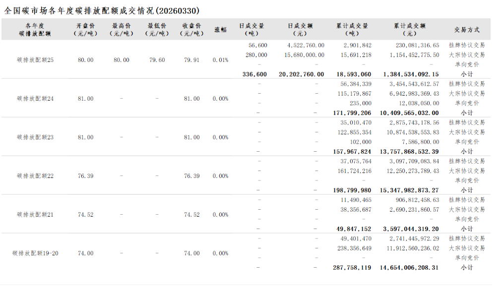 2026年1月1日至3月30日,全国碳市场碳排放配额成交量19,898,821吨,成交额1,488,382,825.75元。