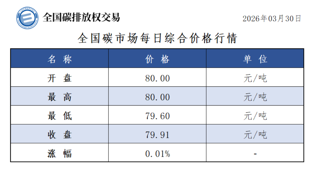 3月30日全国碳市场价涨0.01% 碳排放配额总成交336600吨【交易日报】