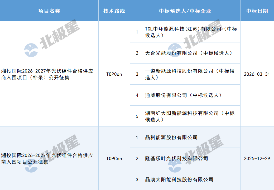 3月31日,湘投国际2026-2027年光伏组件合格供应商入围项目(补录)中标候选人公示,入围企业有TCL中环能源科技(江苏)有限公司、天合光能股份有限公司、一道新能源科技股份有限公司、通威股份有限公司、湖南红太阳新能源科技有限公司。