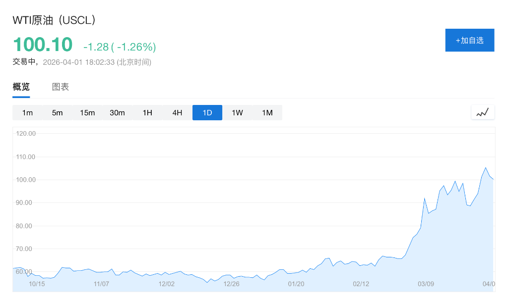 尽管美伊双方释放停战信号,油价涨势暂歇。WTI日内下跌1.26%,报100.1美元/桶,仍维持在100美元上方。
