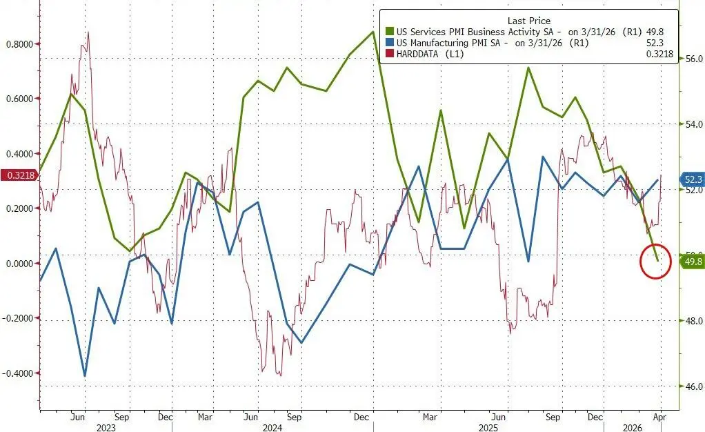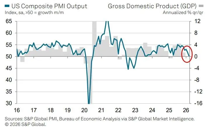 据标普全球(S&P Global)周五发布的数据,3月服务业商业活动指数终值录得49.8,低于初值51.1,也低于2月的51.7,为逾三年来最低水平。与此同时,投入成本通胀加速至2026年以来最高水平,企业正将上涨的成本转嫁给客户,调查数据显示消费者价格通胀或将加速逼近4%。