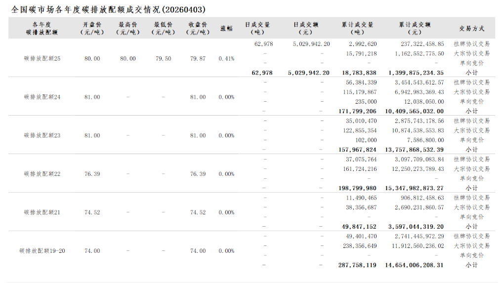 2026年1月1日至4月3日,全国碳市场碳排放配额成交量20,089,599吨,成交额1,503,723,967.95元。