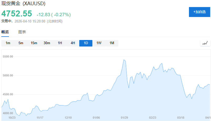 在伊朗冲突爆发初期随全球大多数资产类别同步下挫,尽管停火消息带动一轮反弹,截至周四,较过去一个月仍累计下跌约7%,报每盎司4752.55美元。
