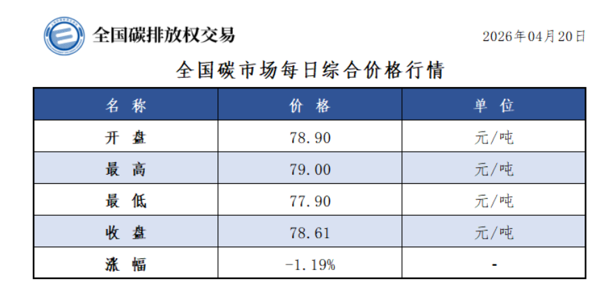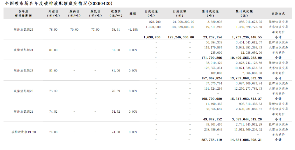 2026年1月1日至4月20日,全国碳市场碳排放配额成交量24,537,915吨,成交额1,841,085,182.15元。