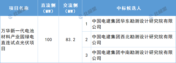 4月22日,万华新一代电池材料产业园绿电直连试点光伏项目EPC工程总承包中标候选人公示,中标候选人第一名为中国电建集团华东勘测设计研究院有限公司。