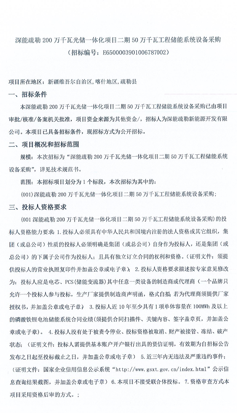 北极星储能网讯:2026年3月23日,新疆深能疏勒200万千瓦光储一体化项目二期50万千瓦工程储能系统设备采购,招标人为深能疏勒新能源开发有限公司。