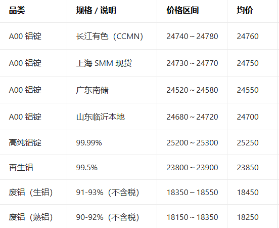 4月24日全国铝现货报价参考