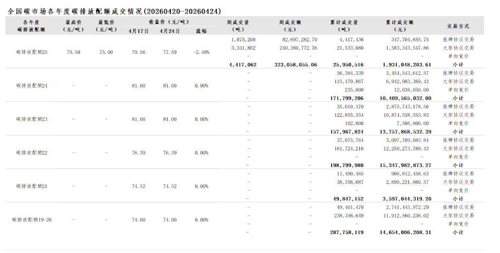 2026年1月1日至4月24日,全国碳市场碳排放配额成交量27,256,277吨,成交额2,034,896,937.21元。