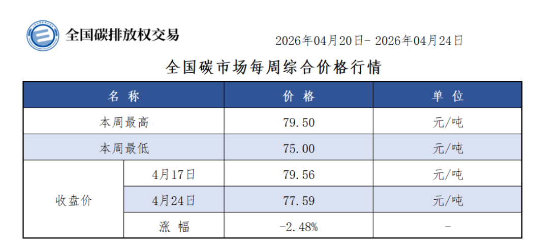 本周全国碳市场综合价格行情为:最高价79.50元/吨,最低价75.00元/吨,收盘价较上周五下跌2.48%。