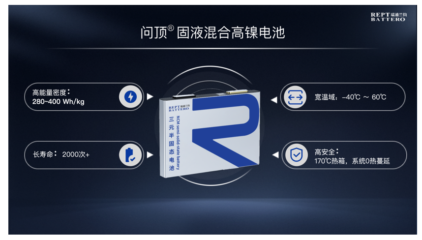 在面向高端长续航、智能电动旗舰车型的高镍体系中,问顶®固液混合高镍电池则通过固态电解质包覆技术与硅碳负极材料的应用,实现了更高的能量密度与更优的安全性能,产品能量密度可达280至400Wh/kg,在170℃热箱测试中实现系统级零热蔓延,为高端长续航车型以及新兴应用场景提供更加可靠的动力支持。