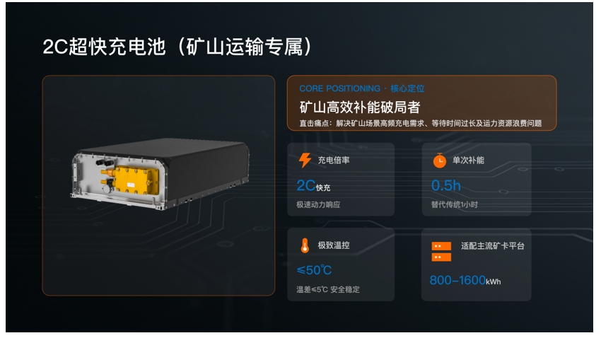 在矿山运输场景中,高频补能一直是制约车辆效率的重要因素。针对这一痛点,瑞浦兰钧推出2C超快充电池方案,通过提升充电倍率,将单次补能时间缩短至约30分钟,较传统1C充电缩短一半等待时间。在同等运力条件下,可实现运力提升11.4%,车辆采购成本降低11%,使车辆运行效率得到有效提升,并在长期运营中降低车队与基础设施投入成本。