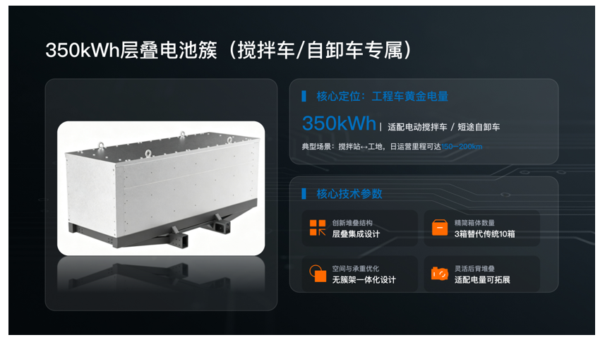 面向搅拌车与短途自卸车等工程运输场景推出的350kWh层叠无簇架电池,采用高度集成的结构设计,通过三箱集成方案替代传统十箱组合模式,取消传统簇架,大幅减少系统组件数量,从源头降低整车结构复杂度与重量负担。这一设计不仅有效释放整车载货能力,同时降低维护复杂度,使车辆在长期运营过程中具备更优的经济性与稳定性,从而在保障电量需求的同时实现更高的运输效率。