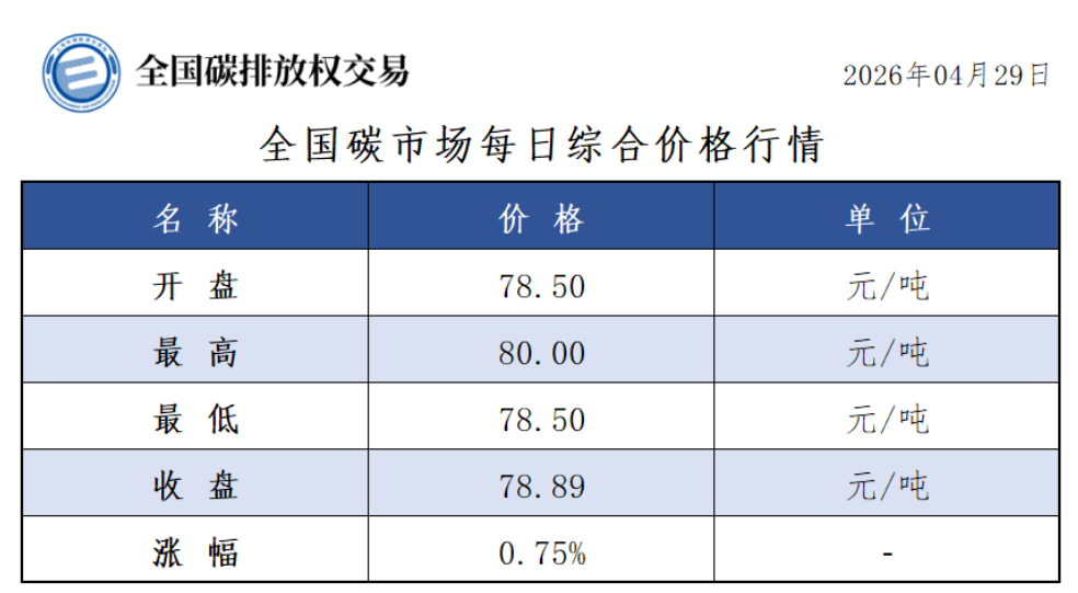 4月29日全国碳市场价涨0.75% 碳排放配额总成交602177吨【交易日报】