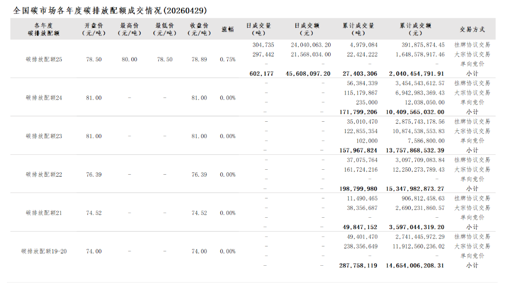 截至2026年4月29日,全国碳市场碳排放配额累计成交量893,575,587吨,累计成交额59,806,921,757.08元。